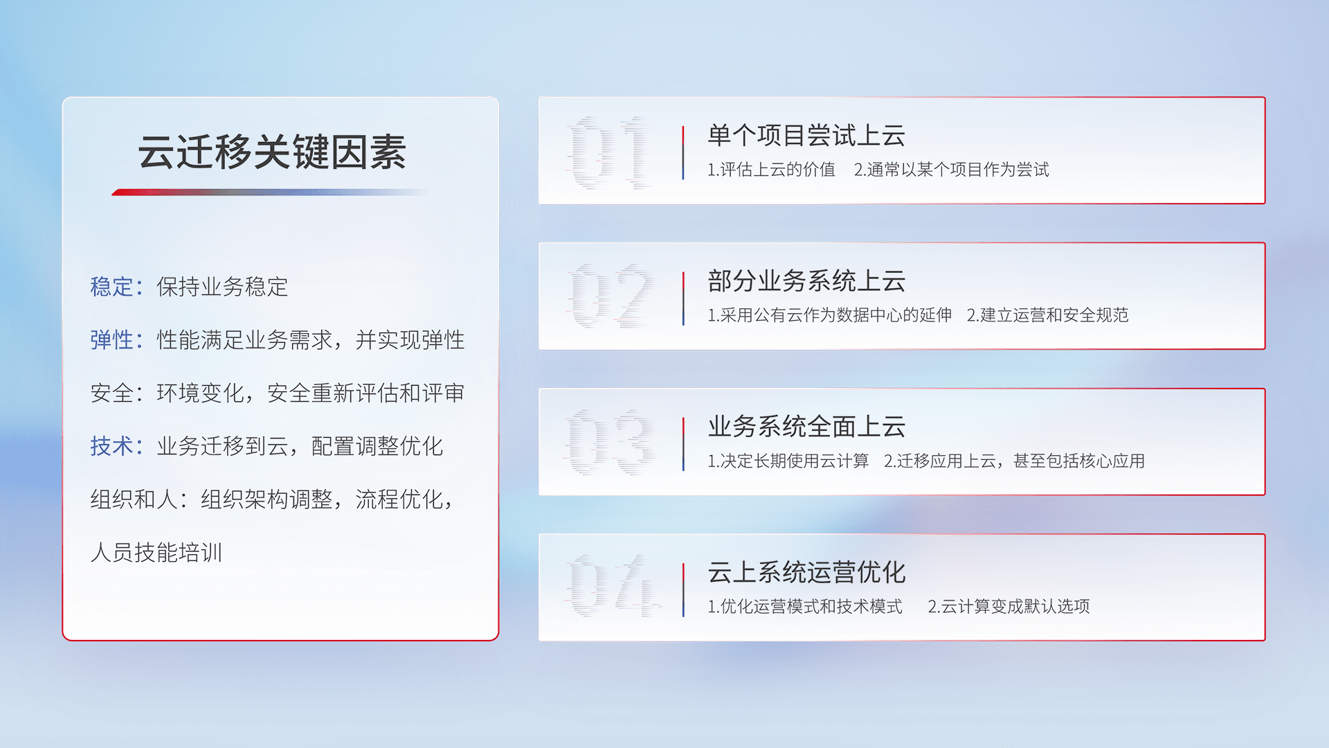 结合实际业务,,,,从规划设计、、、、云平台选型、、云原生改造、、数据迁移、、集成交付,,,,迁移全过程为客户识别最佳上云路径,,,做好风险识别管理,,,设计网络架构、、身份权限、、安全审计合规、、操作审计、、、、日志审计、、、监控告警策略、、、、多站点容灾设计等,,,,对云上基础设施进行整体规划,,,提升IT治理水平,,以满足弹性、、、高可用、、高性能的需求。。。。