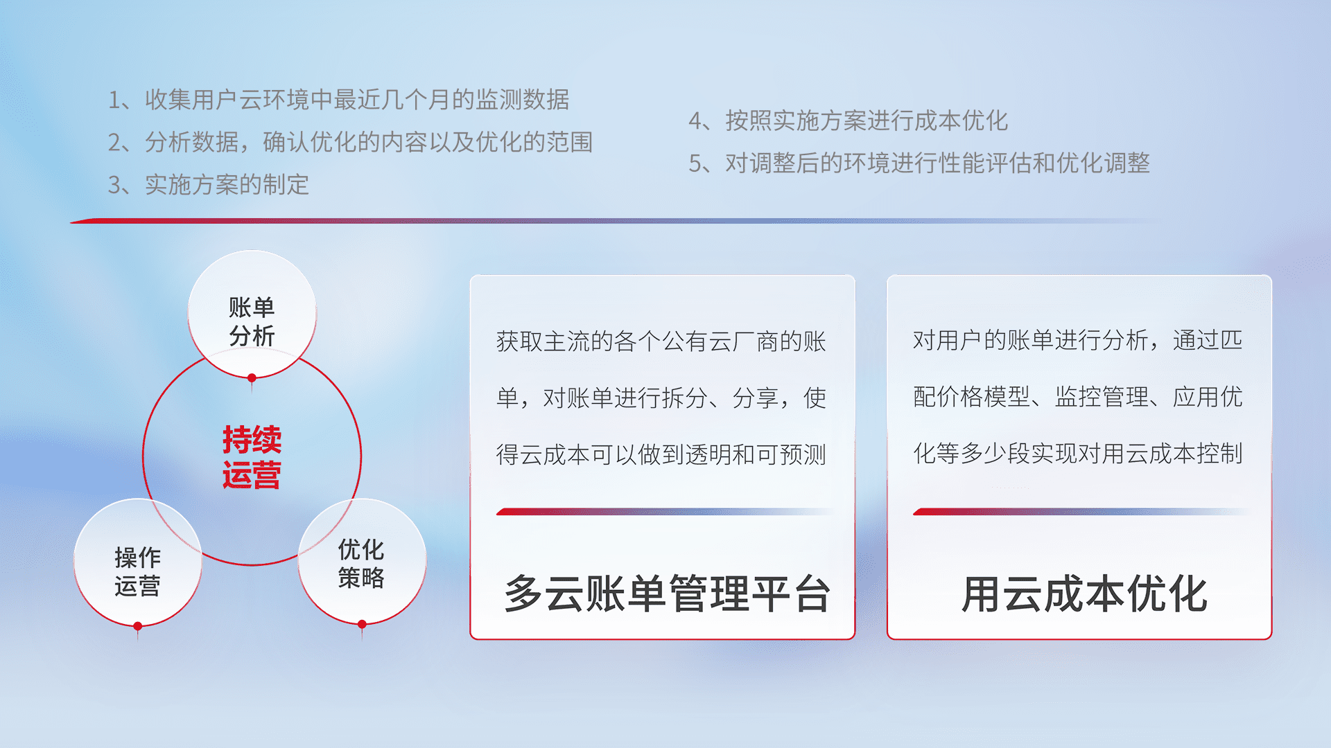 通过多云纳管,,,,以统一的资源数据模型把客户的云资源进行抽象和封装,,,进而实现对多云资源的统一操作,,,,保障云资源管理的可靠性、、稳定性与可用性。。。量身定制化运维内容,,配置、、、开发运维、、、、补丁管理、、、备份、、、监控、、、认证和访问管理、、、审计和日常巡检等,,,,保障在用云过程中的可靠度,,,稳定度以及高可用率。。。
