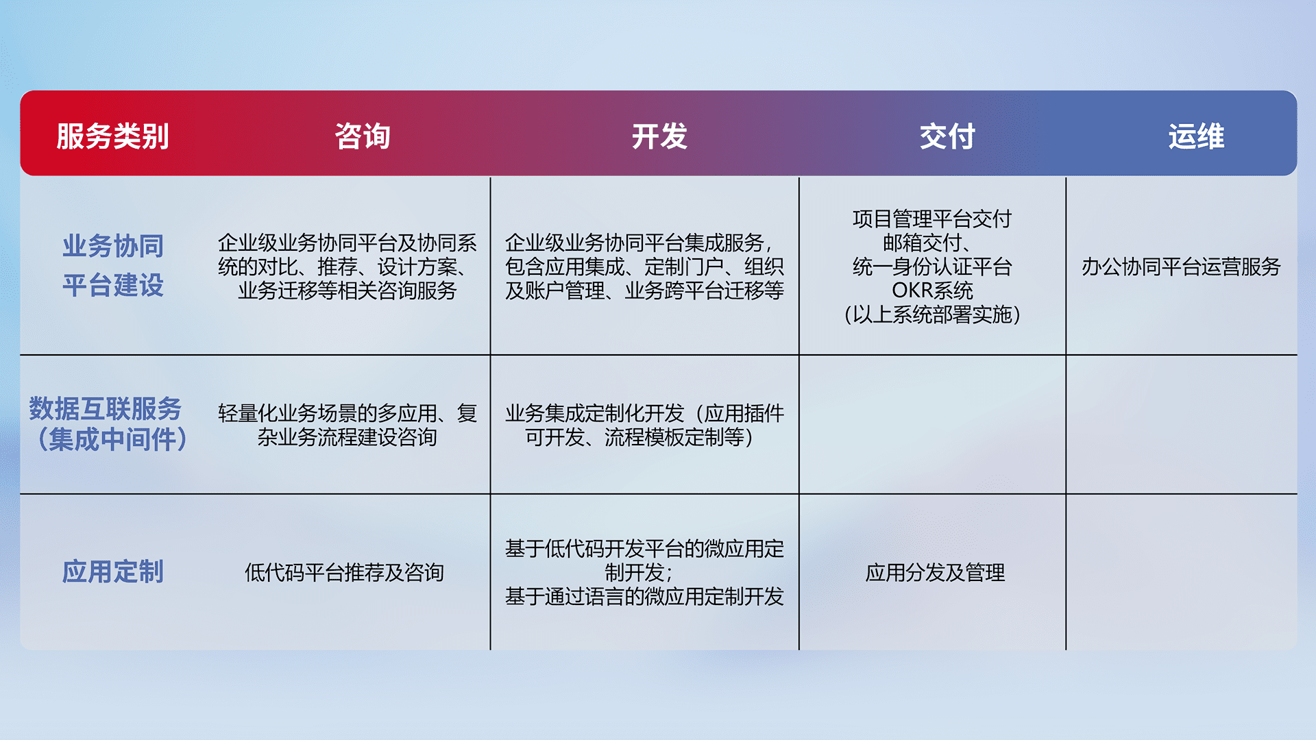 针对钉钉、、、企微、、IDaas等平台级产品提供产品的规划、、、方案、、、、交付、、、、定制化开发等服务,,,,实现如统一协同办公、、、智能客户服务、、混合会议管理、、、、智能数据查询、、等业务场景,,,实现数字化转型。。。。
